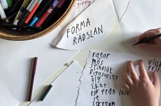 I Låt rädslan ta form arbetar vi med olika sorters lera och naturmaterial, först enskilt och sedan tillsammans, för att ge kropp åt det som skrämmer oss. Under tiden samtalar vi om vad vi tycker är läskigt och hur det känns och får på så vis öva vår lyhördhet och respekt, för både oss själva och varandra. Vi lär oss att arbeta skulpturalt i formandet av vår egen rädsla, och övar oss sedan i samarbete och konstruktion när allas skulpturer ska sammanfogas till ett större, kollektivt verk. När vi är klara har vi en gemensam skulptur av våra rädslor!