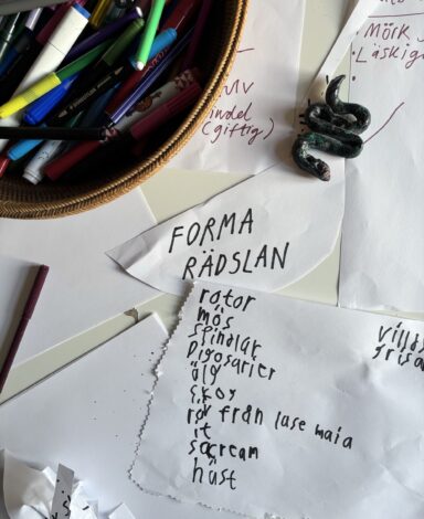 Kort presentation av min konstnärliga praktik där jag visar bilder och berättar om hur jag brukar utgå från mina rädslor i val av motiv. Vi diskuterar gemensamt exempel på vad en rädsla kan vara. Jag formar en orm i lera som ett exempel på en av mina rädslor.