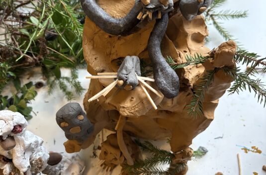 När vi är klara samlas vi runt skulpturen och betraktar vårt gemensamma verk för en frågestund och utvärdering. Den som vill dela med sig av berättelser om sin rädsla får gärna göra det. Vi funderar också på om vi vill ge skulpturen ett namn, eller en kort saga.