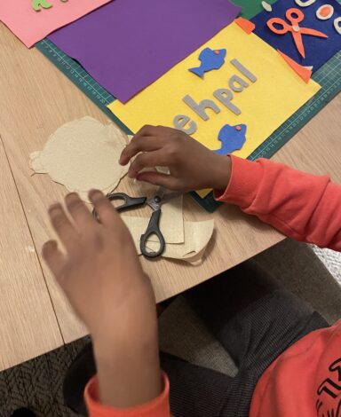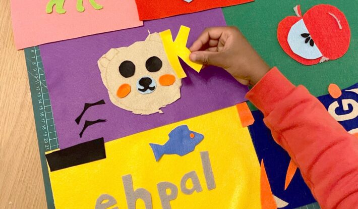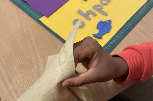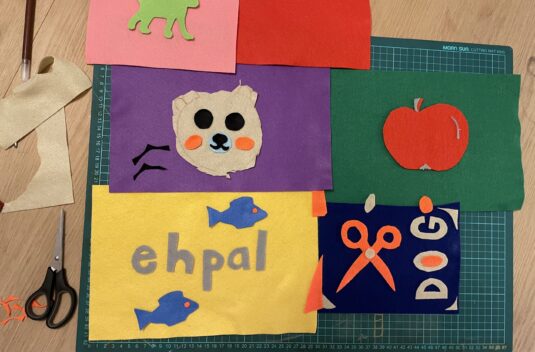 Sedan ska eleverna skapa egna bilder och bokstäver, eller om de hellre vill skriva ut bilder och använda bokstavsschabloner i en collageteknik. Vi tecknar, klipper och limmar i färgat papper och filt för att skapa ett eget verk som kombinerar bild och ord. Under tiden vi arbetar samtalar vi om språkets betydelse för kommunikation, bildanalys, tolkning och vad som uppstår i mötet mellan ord och bild.