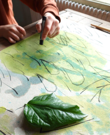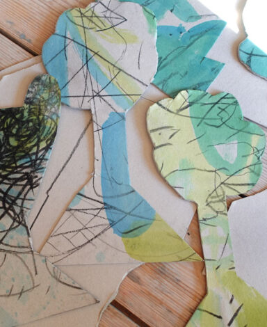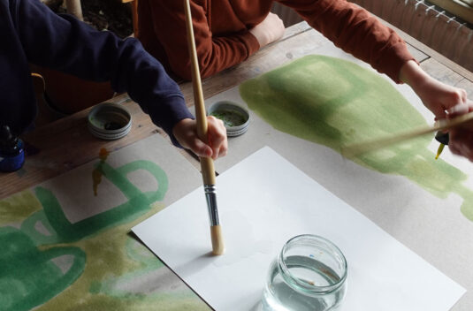 Sedan finns det flera roliga övningar som gruppen kan sätta igång med, beroende på elevernas schema, ålder och vilka material som finns tillgängliga. Vid arbete med tusch/droppteknik/vått i vått arbetar vi med större ark papper som vi sedan klipper ut och sätter upp på ett långt spännpapper på väggen, eller på en större vit foamboard med pappersyta med stor pensel och tusch i gröna nyanser i vått i vått teknik. Vi kan också arbeta med återbrukad wellpapp med gouache eller akrylfärg.
