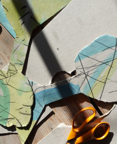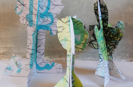 I nästa steg arbetar vi med tjock kolpenna och gestaltar abstrakta former från trädens olika delar på det målade pappret, med ting från naturen som inspiration. Med egna eller färdiga mallar av träd klipper vi ut två likadana former ur pappret, som sätts ihop till tredimensionella träd och ställs samman i en gemensam skog.
