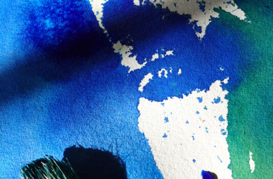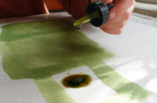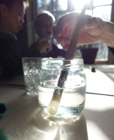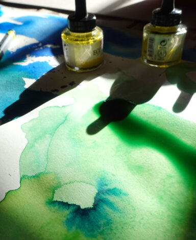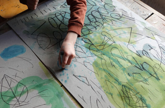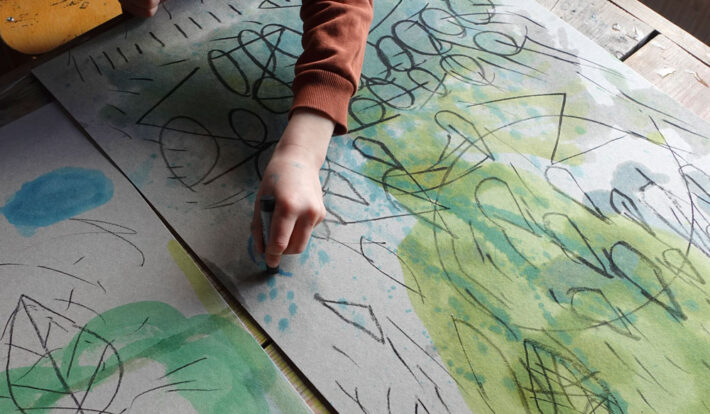 Vi arbetar tillsammans på större ark papper, wellpapp eller vit foamboard med pappersyta. Jag visar hur eleverna kan skapa olika effekter med färgerna.