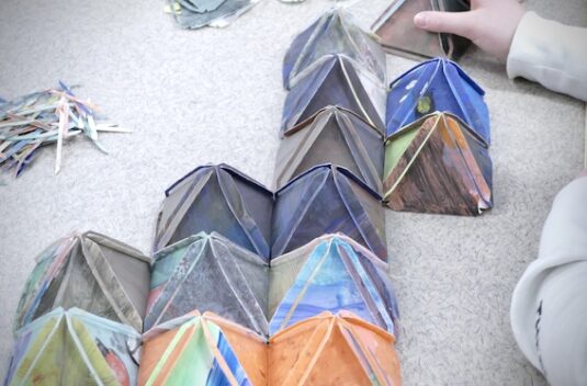 Vid det tredje tillfället bearbetar eleverna materialet vidare med en handvevad stansmaskin som skär upp det till trianglar som går att koppla ihop med varandra. Vi bygger själva skulpturen med trianglarna/byggstenarna så att varje persons bidrag adderar och stärker helheten.